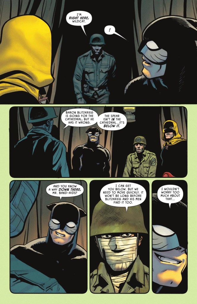 This books insides look pretty great, thanks to guest artist Gavin Guidry, who first shows us Hourman and Wildcat meeting DC’s number one battle star Sgt Rock. And he’s not the only war hero on hand.