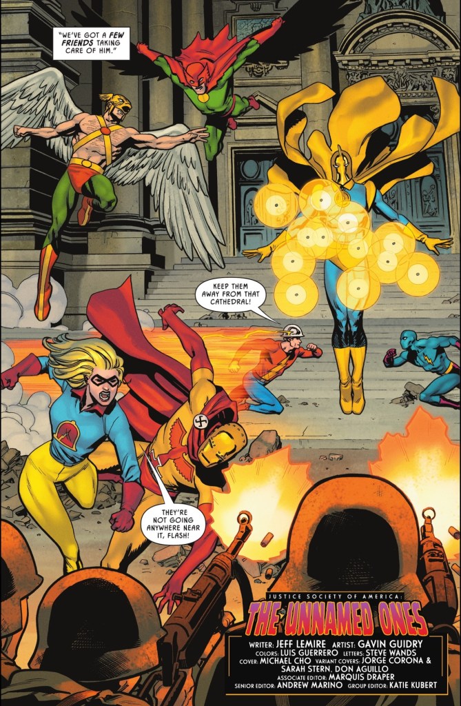Writer Jeff Lemire’s script gets better from here, as we join their JSA team-mates – or perhaps that should be All-Star Squadron as Liberty Belle is there – at the cathedral in Berlin, where they’re facing the trio of bruiser Baron Blitzkrieg, speedster Zyklon and, er, someone who looks like a Nazi Flying Fox. Anybody?