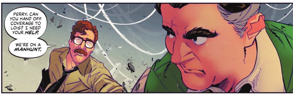 Lois gets a great action moment, and has fun teasing Bruce as Bruce teases Clark, Gutiérrez does a very nice job with Clark’s reactions, I love it when all the tools in the comics tool kit are put to good use. The vanished Lois is clever, I’ve never seen that previously. And illustrator and colour artist use silhouettes superbly several times.