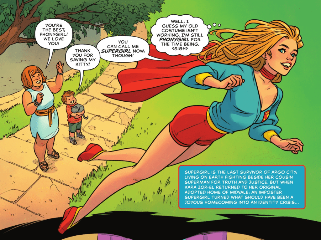 Crazy Kandor kid Lesla-Lar wants Supergirl’s life. She’s hypnotised Kara’s Earth parents and convinced the town of Midvale she’s the real deal. Kara’s regular costume having been vandalised by Lesla, she’s resorted to an older look and is doing good regardless.