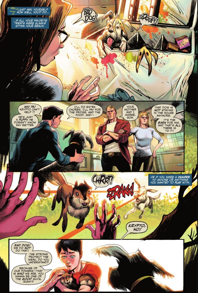 … and now we find that he’s seemingly never seen Krypto in his life, neither the classic mutt, nor the slightly curlier movie version. This dog, with massive eyebrows, looks like Green Lanteen G’nort (and yes, I know I made the same remark as regards Tee-Nah on the cover of the first issue… is it my fault Albuquerque keeps drawing G’nort?).
