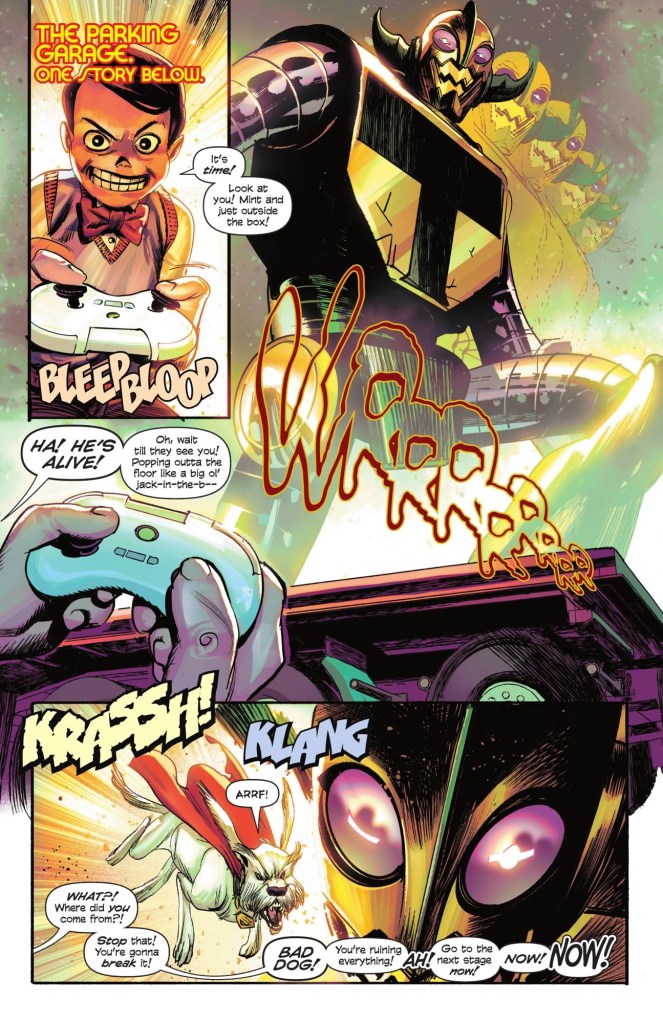 In the present, the Superdog looks for amusement and follows the scent of Winslow Schott, the terrible Toyman. He doesn’t find the villain, though, just something with his imprint.
