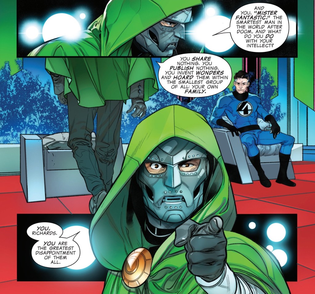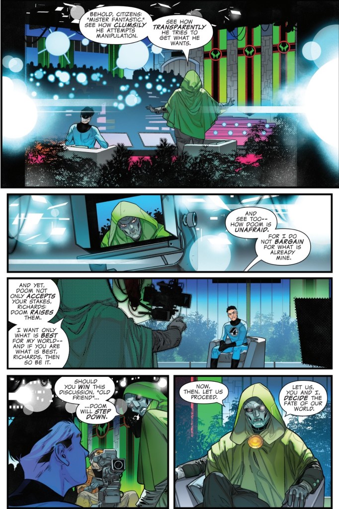 If Reed has one weakness, it’s hubris. “If Doom can justify his rule to anyone, then surely he can convince the world’s smartest man,” he says. So while Reed tries logic to persuade the world to reject Doom’s rule, Doom also employs logic… along with some uncomfortable truths.