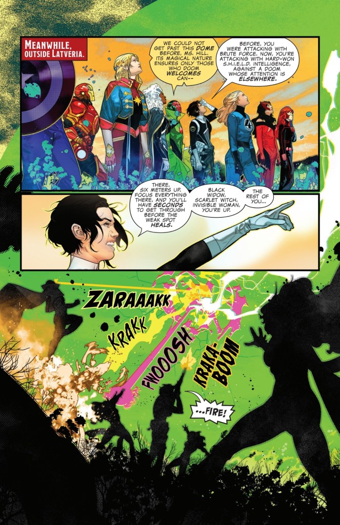 David Curiel’s bright colours are splendid, a contrast to so many books from the House of Ideas that seem to be toned in Marveldirge. The Latverian sequence, in particular, looks fantastic, from the heroes’ energy blasts to the various nods to Doom’s trademark green.