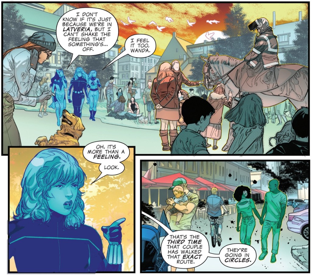 The Black Widow, the Scarlet Witch and the Invisible Woman slip through the hole in Doom’s dome, use their talents to go undercover, and discover that the happy scenes that greet them aren’t real.