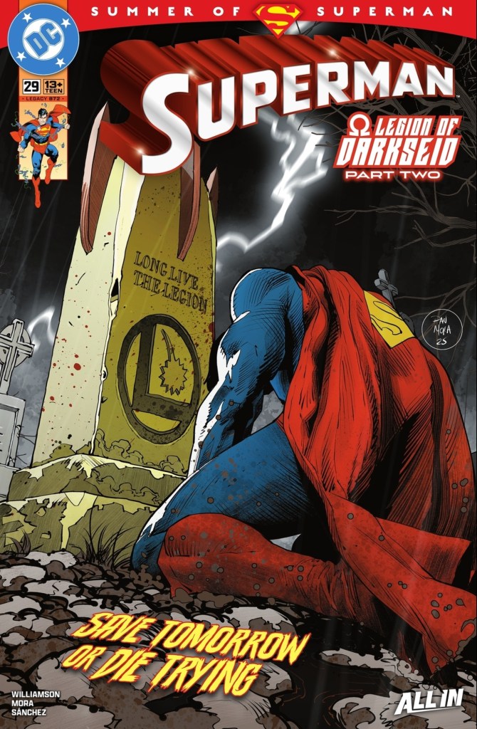 Now here’s a cover guaranteed to put this comic at the top of my reading pile – a devastated Superman mourning the loss of his old friends in the Legion of Super-Heroes. Artist Dan Mora has come up with the perfect tombstone for what looks like a headless Superman to stare at.