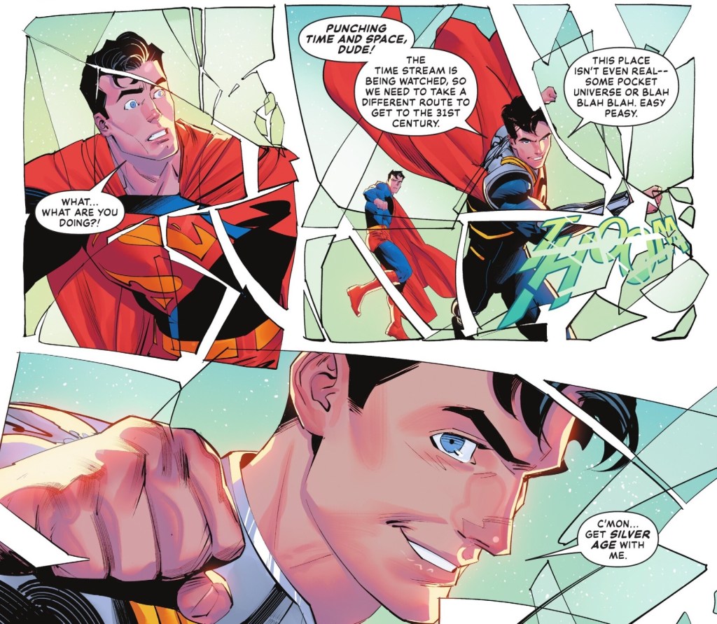 Speaking of headless, this chapter of ‘Darkseid’s Legion’ guest stars the character known for knocking the heads off heroes – Superboy Prime. As he’s recapping his story on the first page, we see one of those moments – in shadow, happily, with the lost bonce out of shot. The young hero driven mad by being stuck in limbo for years, finally redeemed in DC’s Metal event, has been recruited by the Time Trapper to help Superman against the twisted Legion of Super-Heroes he met last issue. Superman isn’t impressed.