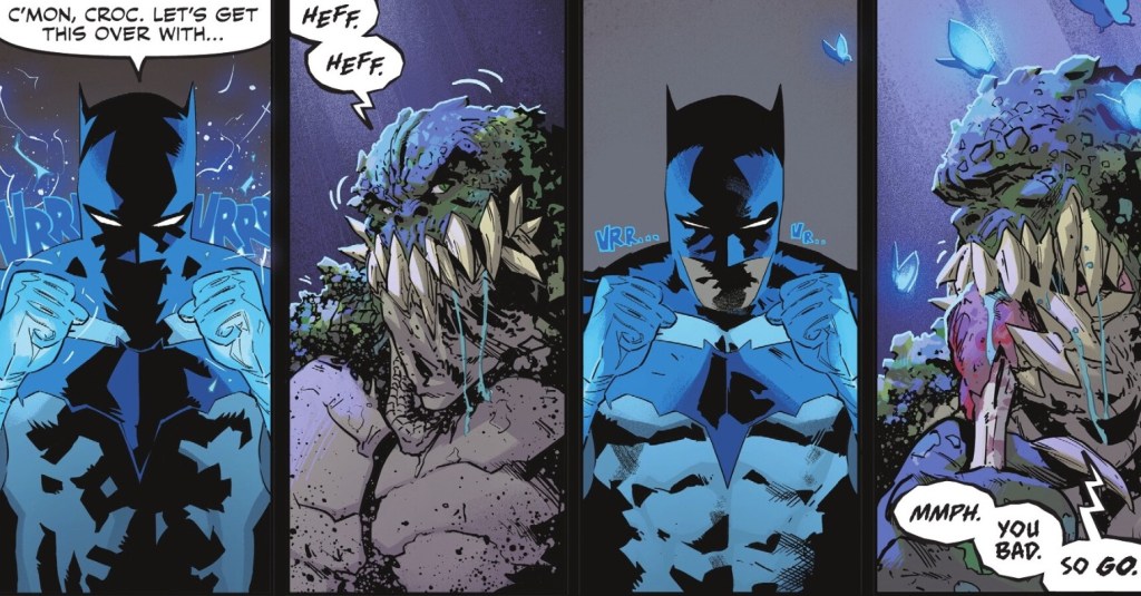 A word from AI-lfred has Batman think again as to whether a person can change. He puts down his new electric gauntlets, and, as Croc calms down, pulls down his mask.