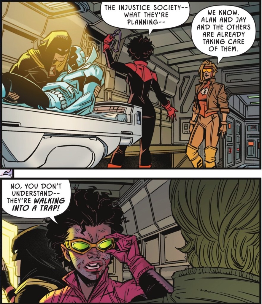 Not Jesse Quick, though, she’s fully alert as she flies with husband Hourman in search of the missing Dr Mid-Nite.