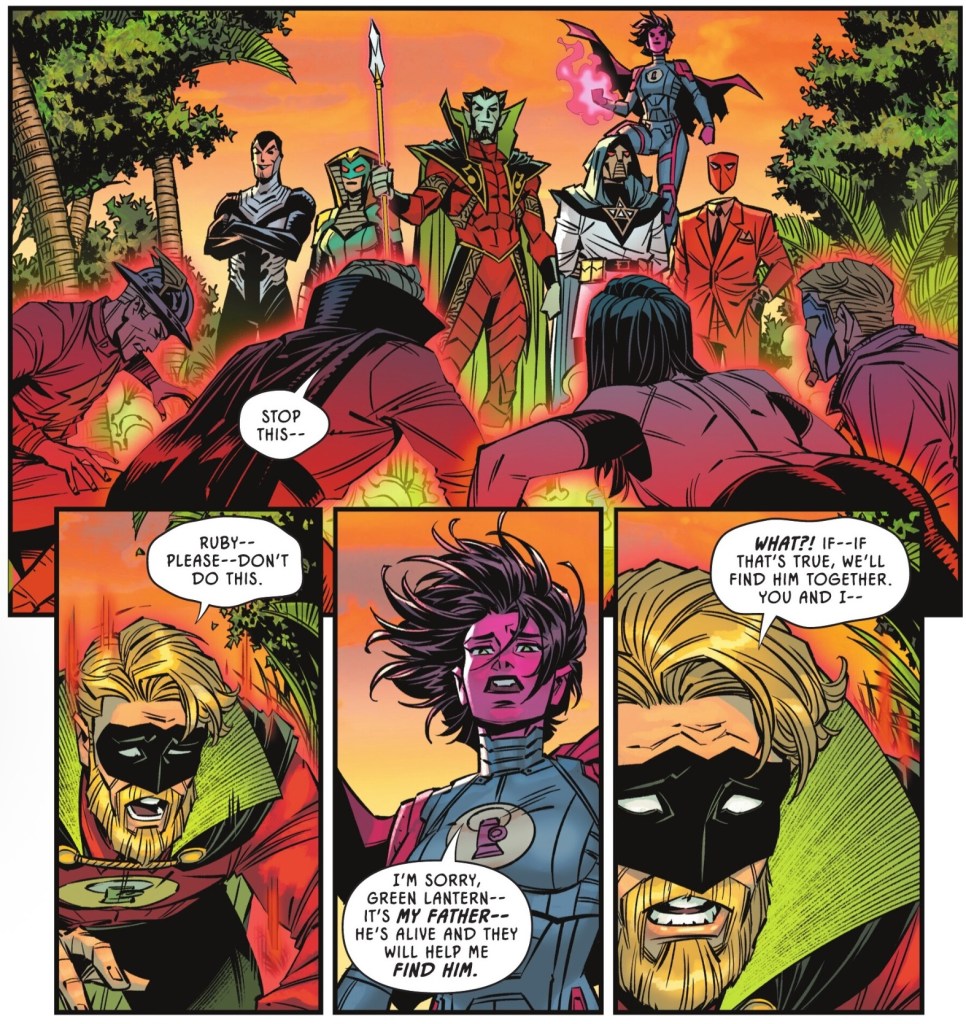 I did enjoy the insight into why Red Lantern Ruby, a JSA-er for about three minutes a couple of years ago, has joined the bad guys; she’s an idiot.