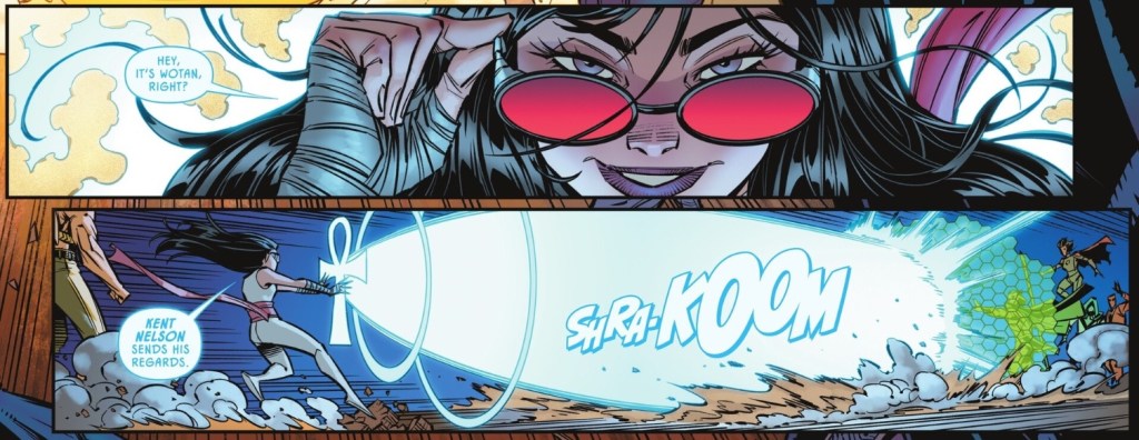 I’ve no complaints about the art of illustrator Diego Olortegui, which is packed with people yet somehow attractively airy. All the heroes and villains look good, with standouts this issue being Kid Eternity and Dr Fate. The page with the bulk of the heart to heart is far more interesting than a talking heads two-hander has any right to be. And the touchdown of the JSA’s Steel Eagle plane is tremendous, helped by the vibrant colours of Luis Guerrero, who also does standout work on the cliffhanger splash. Letterer Steve Wands, as always, has the words on the page looking great, his distinctive dialogue font being a real asset.