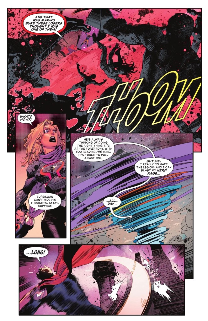Yesssss! I indicated last time I was not delighted to see Prime back after he got his happy ending, and hoped his heel turn towards the Legion of Super-Stinkers was a feint. And here’s Prime, making like a red and blue tornado, his innate Clark Kent ensuring he stands up for what’s right. He even makes one heck of an inspirational speech.