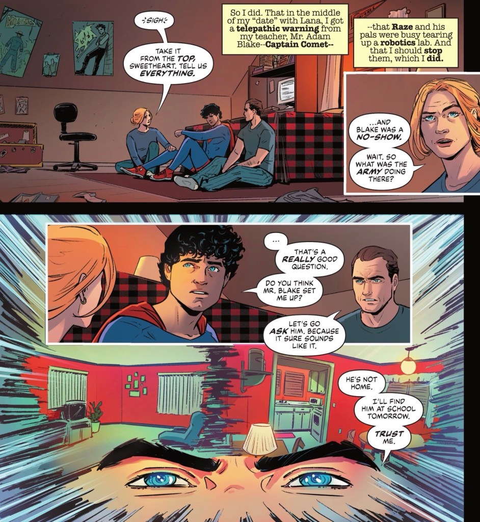 Pete’s rescuing of Clark from frogicide has me wondering if this version – who we can now assume is from the Birthright origin – went on the famous camping trip and learned Clark’s secret ID… I’m on a cruise this week and spotty wifi keeps me from checking over at DC Infinite. It could be that Pete is ‘just’ a great friend to Clark and when he stops him being bashed by bully Kenny Braverman earlier this issue, there’s no Superboy-related motive.