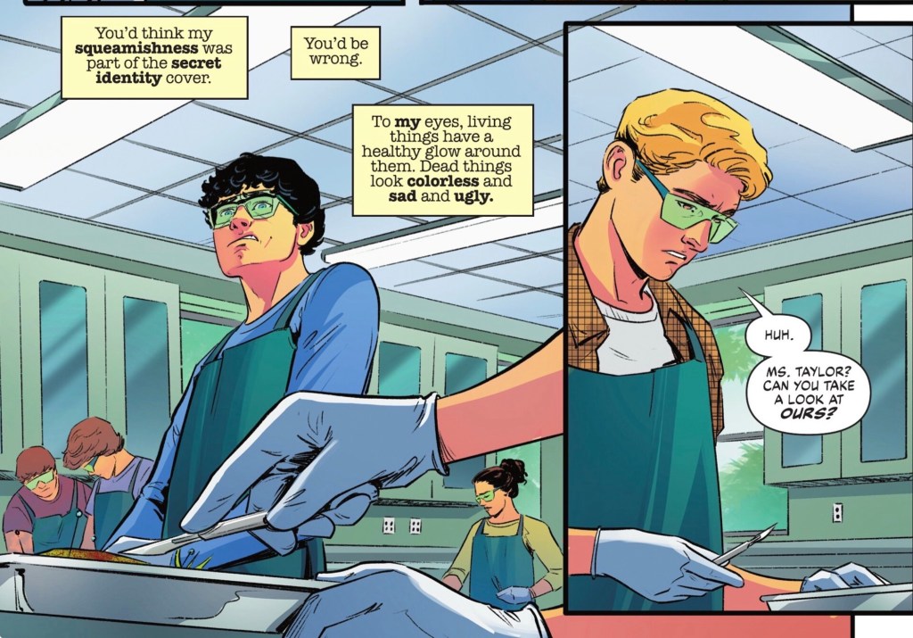 Which might be OK, except Comet has now put Superboy on the radar of the US government. ‘You’ll figure out something,’ is the unwanted mentor’s helpful response, before he flies away, leaving Clark to resume his school day. That involves chopping up a frog.