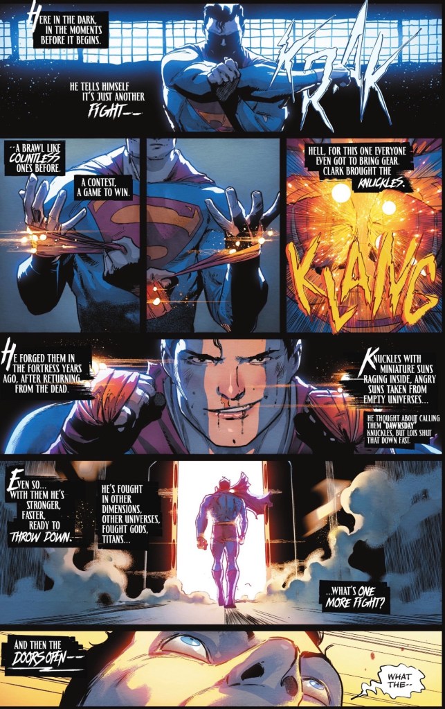 Could he be any more excited about getting a chance to use his Super-Knuckledusters? Can you, in a million years, ever imagine the Man of Steel forging such a grim weapon?