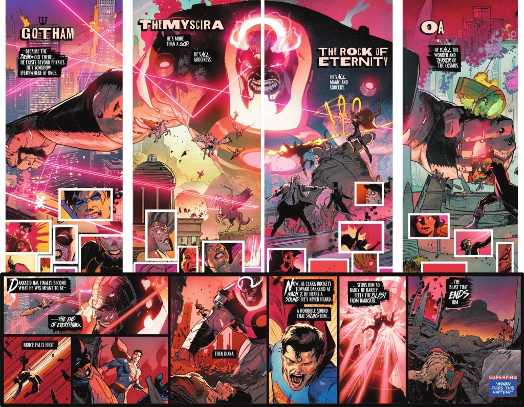 More on that later. The issue opens with the news that Darkseid is coming and they’ve a week to save their reality, but they turn down what seems like a pretty reasonable offer from…