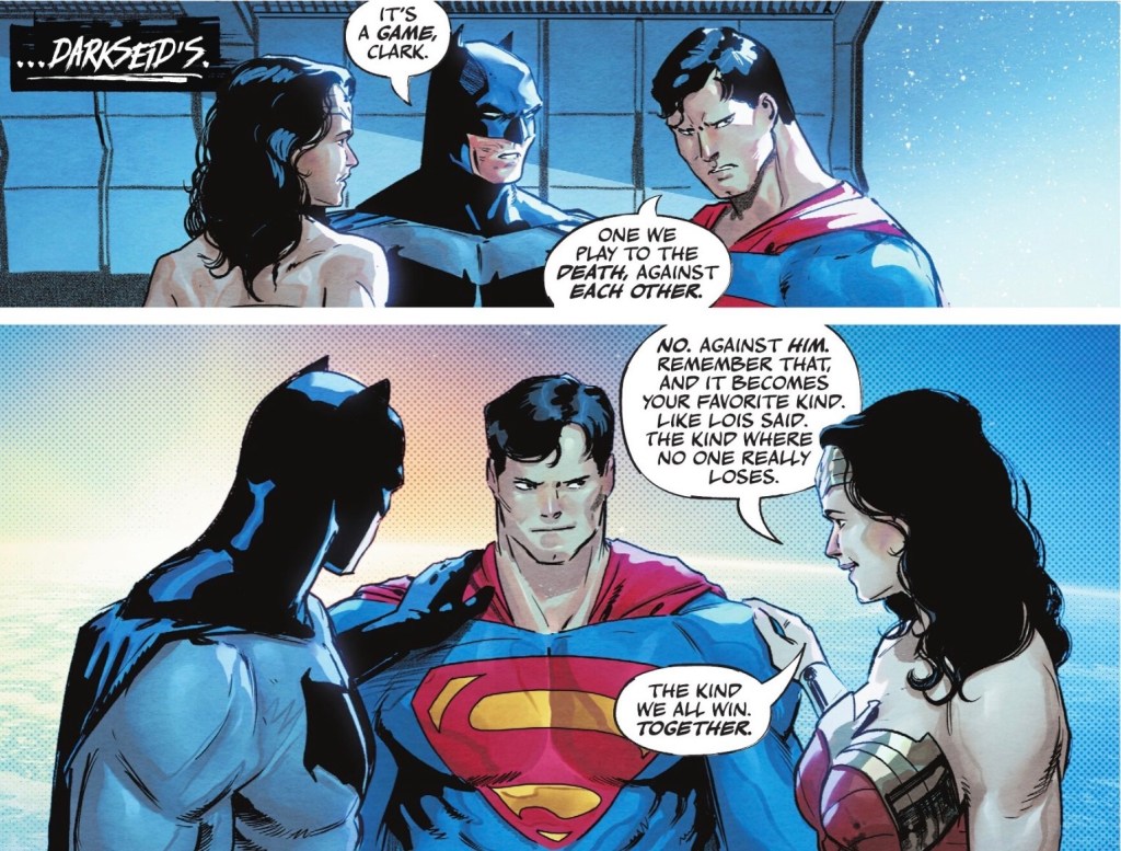 Superman is not keen, but Batman and Wonder Woman bring him around by reminding him of what fun they have on DC Trinity Board Game Night (it’s a thing, apparently).