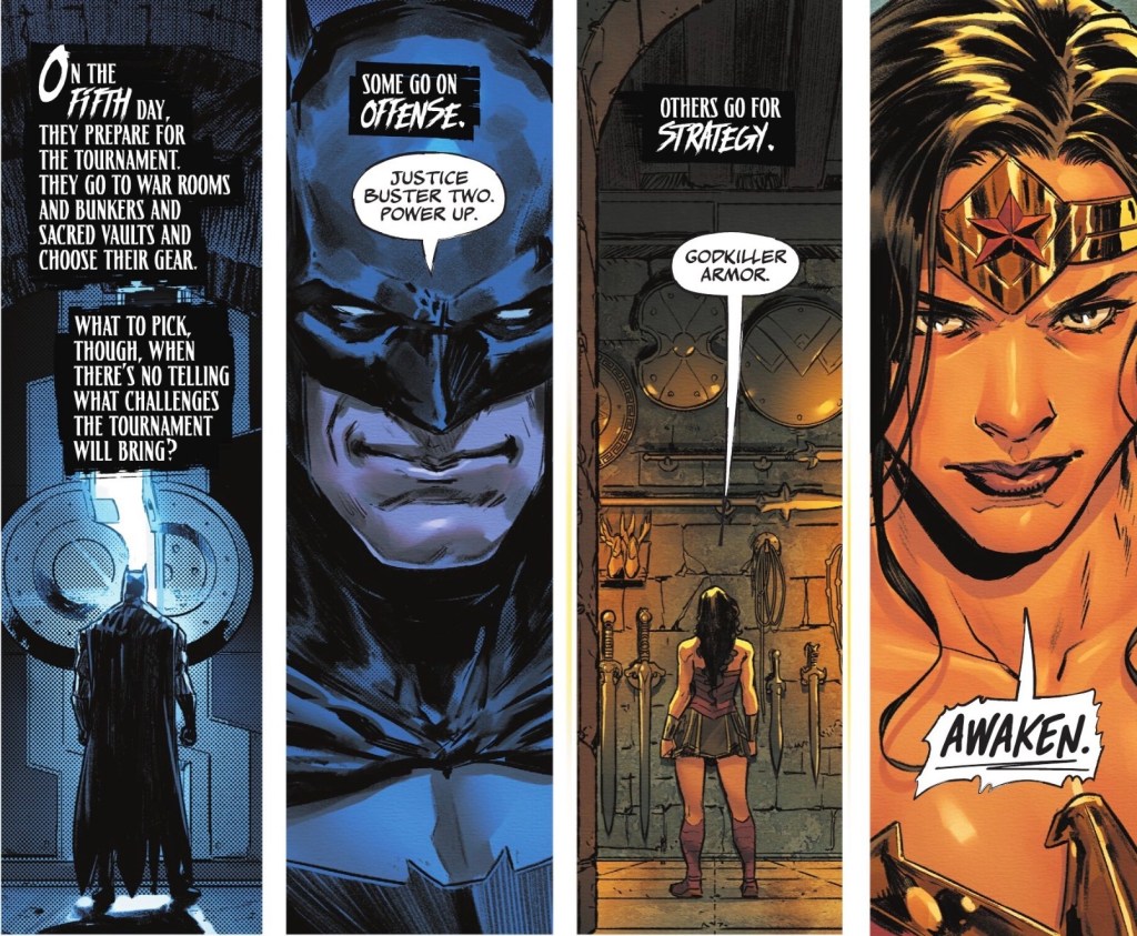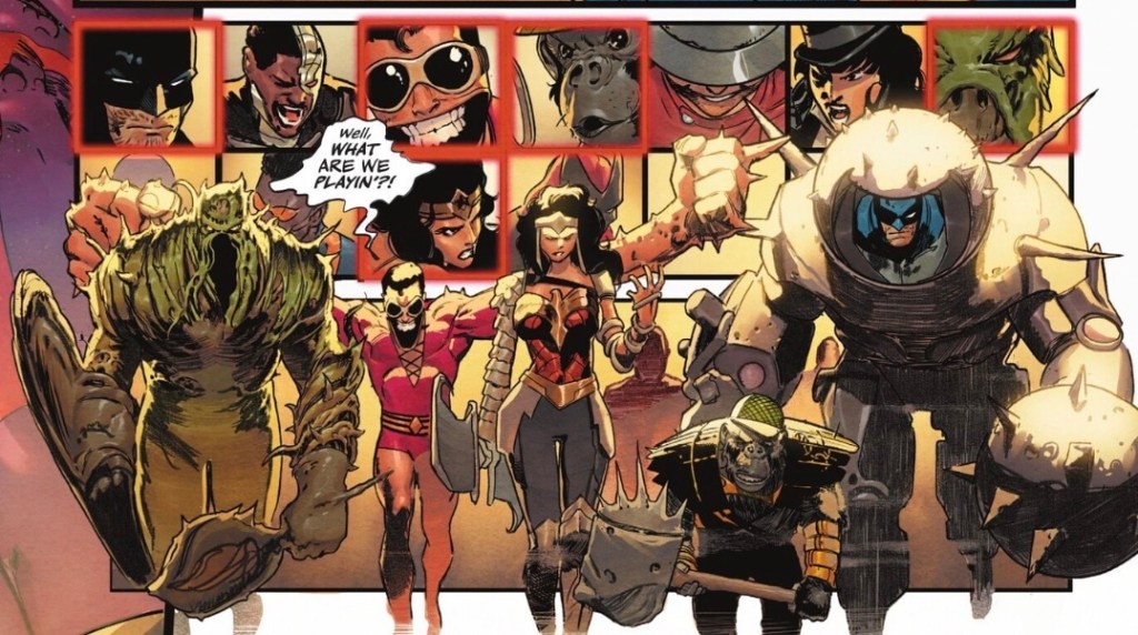 Most of the art comes from Javi Fernández, with Xermánico handling an ‘Interlude’, which I guess means the time-out pages detailing prep week. It’s all fine, bar some blotchy non-faces from Fernández at the start of the issue. Everyone is recognisable, though a big part of that is colourist Alejandro Sánchez, who does an excellent job throughout. Fernández isn’t the best at facial expressions but shines in the big action scenes, and I like that as the games begin, several pages are laid out to mirror the board game played earlier in the issue by Superman, Batman and Wonder Woman.