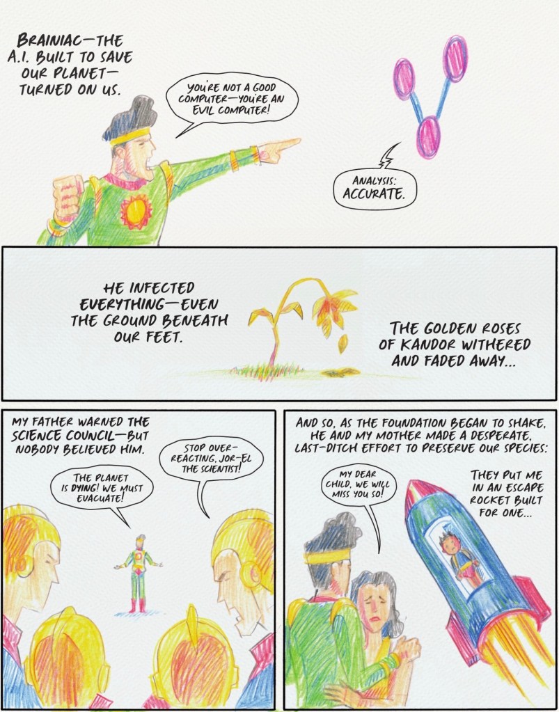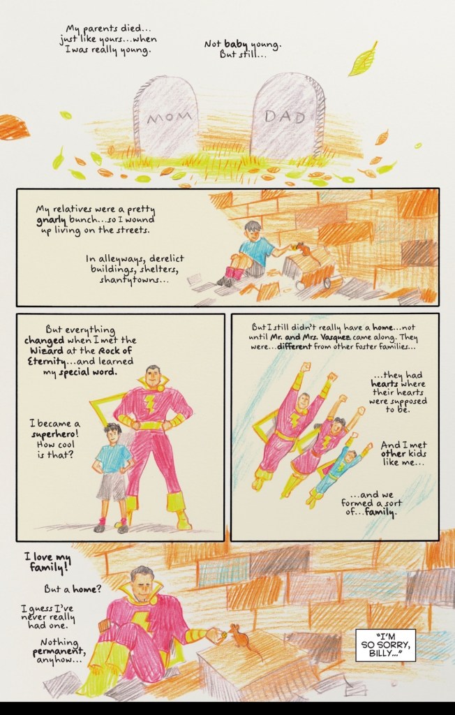 Martín Morazzo’s cute cover image, nicely coloured by Chris O’Halloran, sets the tone for the issue. OK, to me losing billions of people as your home planet dies seems a lot worse than being a foster kid, but the point is, what does home mean to Clark and Billy?