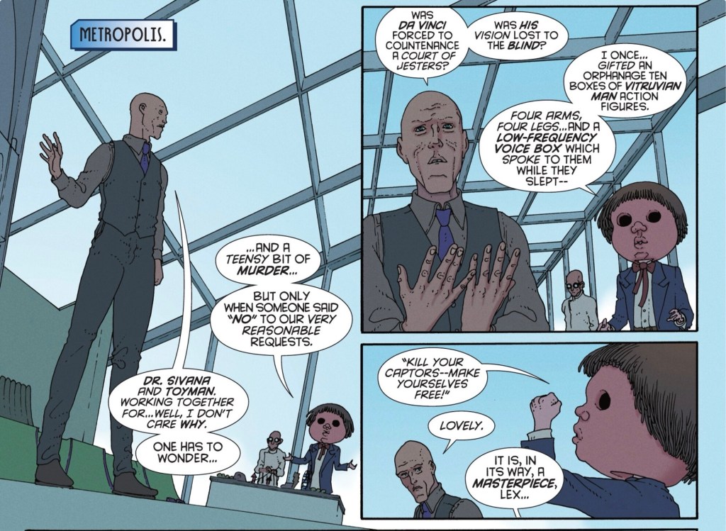 Luthor continues to be a grandiose stinker, while Lois is as feisty as you might wish for. Sivana is in classic mode and Toyman is at his creepiest.