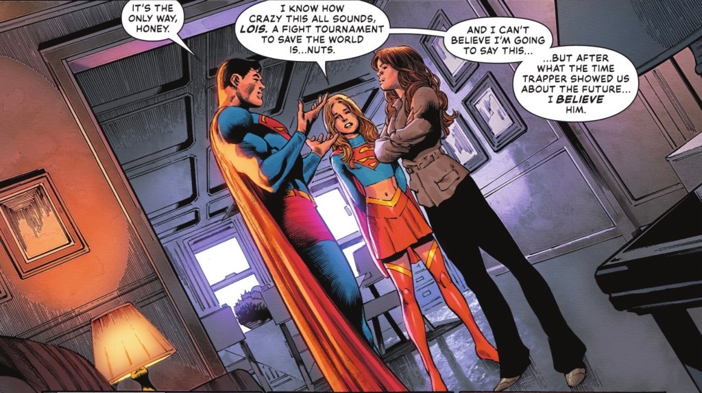 Mrs Superman Lois Lane is equally perturbed at the idea her husband’s going away to what’s been set up as a fight to the death for all but one participant.