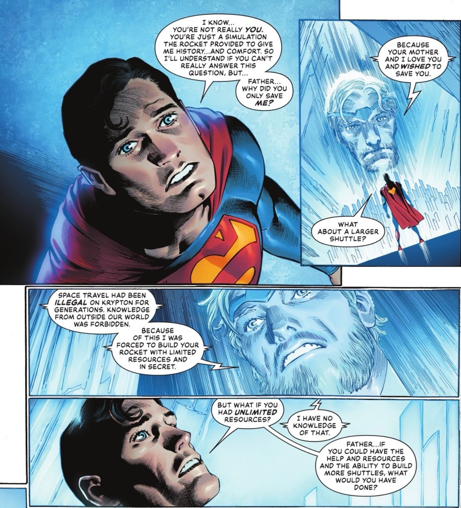 Was Holo-Dad holding back, I thought it was just glitching? Whatever the case, Jor-El’s rep should improve now Mark Waid has laid down a path to wipe out Mr Oz as Jor-El.