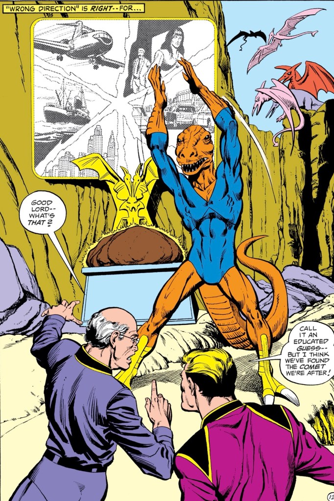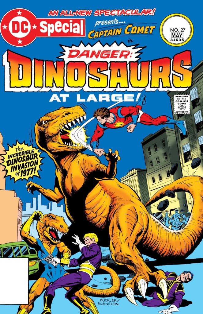 Asked to appear on the show, I plumped for a favourite comic from my teenhood, Danger: Dinosaurs at Large! Written by Bob Rozakis and drawn by Rich Buckler and Joe Rubinstein, it had Captain Comet and Tommy Tomorrow facing ‘the incredible dinosaur invasion of 1977’. The good Captain – recently seen in Action Comics – back then was a regular in the Secret Society of Super-Villains series, and it was a great surprise to see him get top billing in a giant special. OK, it was top billing over Tommy Tomorrow…