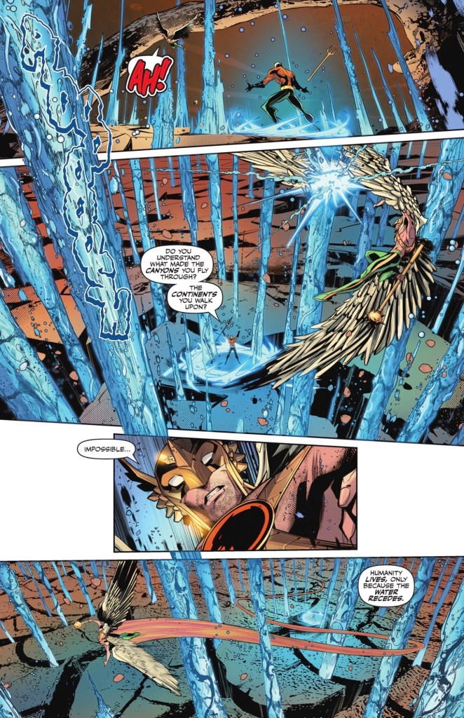 That was cold! Pulled out Hawkman’s blood and all. Aquaman is definitely too powerful for no good reason, but that’s what needless power-ups will get you. The trouble is that in order for other heroes like Hawkman to be viable, as we see in the story, they have to receive needless power-ups as well. Hawkman says he has countless years of experience in war, which amounted to barely anything. No strategy, no plan, just fly and die. Great review, though.