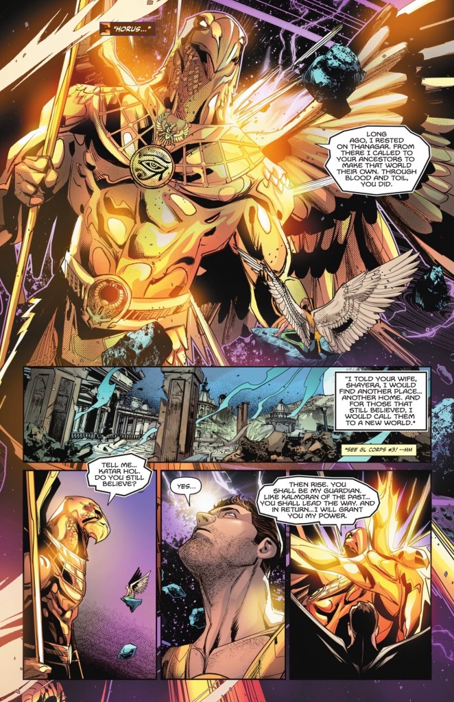 Aquaman’s plotlines have somewhere to go, but what about Hawkman? Will we see him again in DC KO? Is there a new series to follow? I vaguely remember some Hawkgod business around the time of Zero Hour, but is this connected? There is a link to the current Green Lantern Corps series – which I’ve dropped after last issue, too many names and stories going on – and Horus is a great design.
