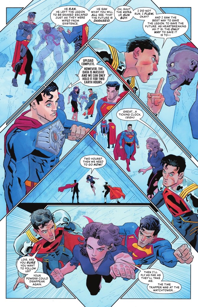 As we’re in the Superman series rather than a DC KO tie-in special, we get a subplot… well, a side plot really, as it’s connected to the overarching threat of Darkseid. His evil Legion of Super-Heroes have been acting as his attack dogs, but the currently reformed Superboy Prime recently held them off. Last issue, though, he left his 31st-century duties and turned up in the present, because, he says here, ‘I found something out about the Legion that Superman needs to know, to give him his hope back’. Not so, claims a defeated member of said Legion who followed Prime to 2025 and got his arse roundly kicked.