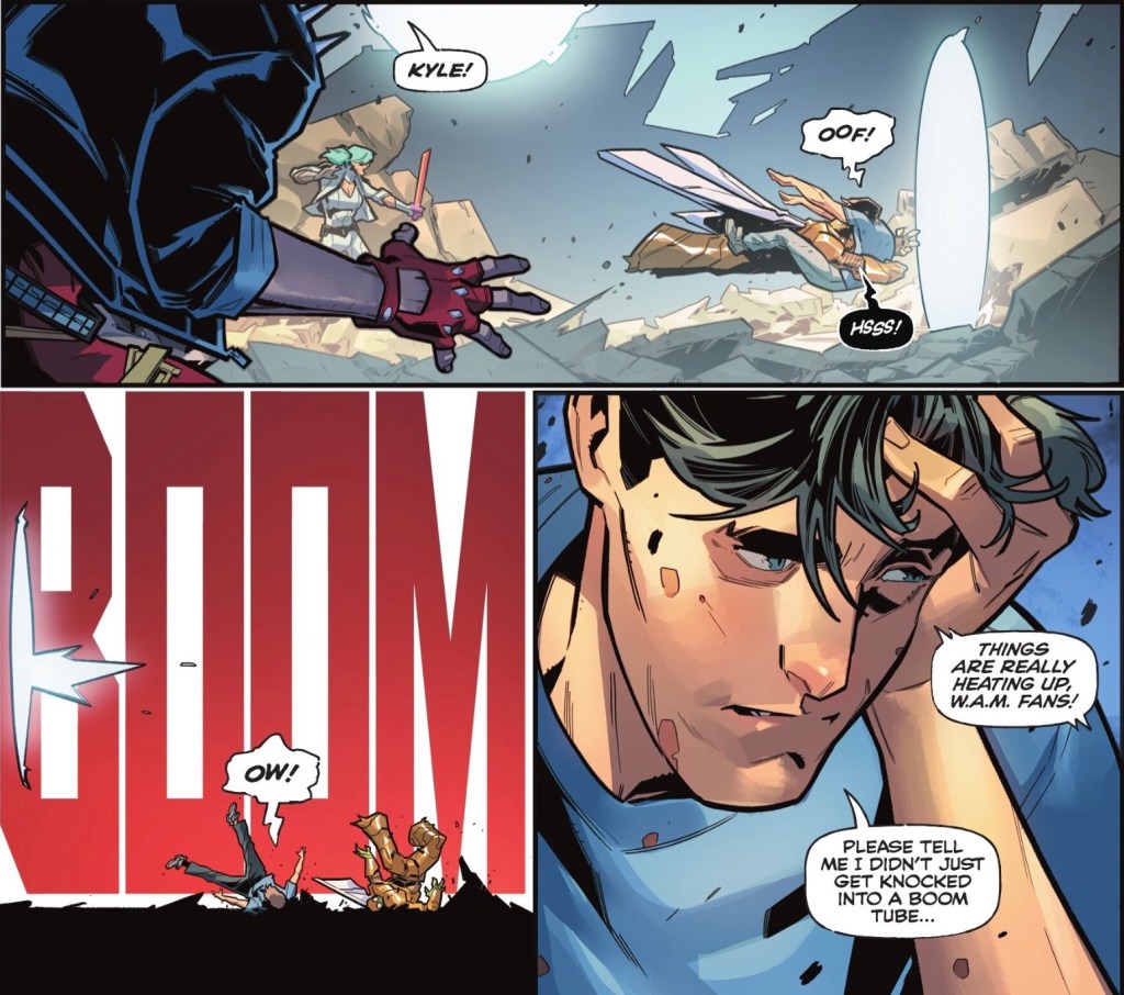 The issue opens with Kyle, Superboy Kon-El and bounty hunter pal Odyssey fighting Darkseid’s parademons on Earth as the KO tournament takes place in Skartaris. Kyle uses his White Lantern powers to clear the battlefield, making him vulnerable to parademon attack.
