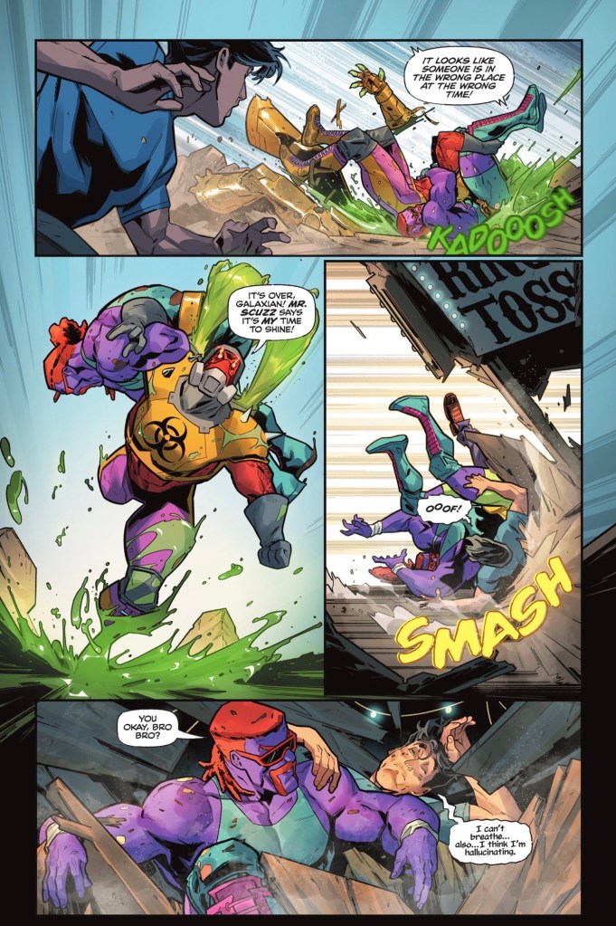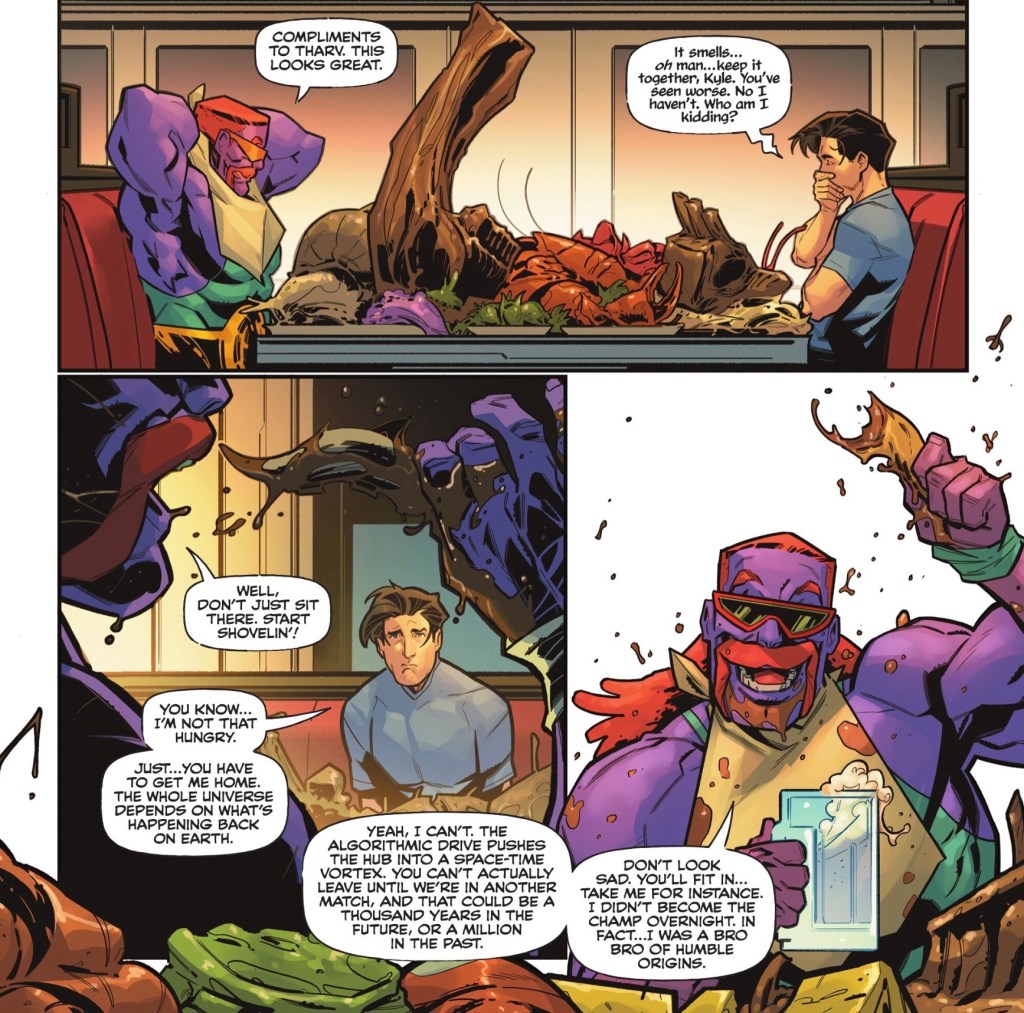 The red-headed space wrestler is Omega-Bam-Man, who we first met in a 2022 issue of Flash written by this issue’s author, Jeremy Adams. Winning his bout, and knowing the planet they’re on is about to die in a nuclear conflagration, Bam teleports himself and Kyle back to The Hub, headquarters of WAM (Wrestling Across the Multiverse).