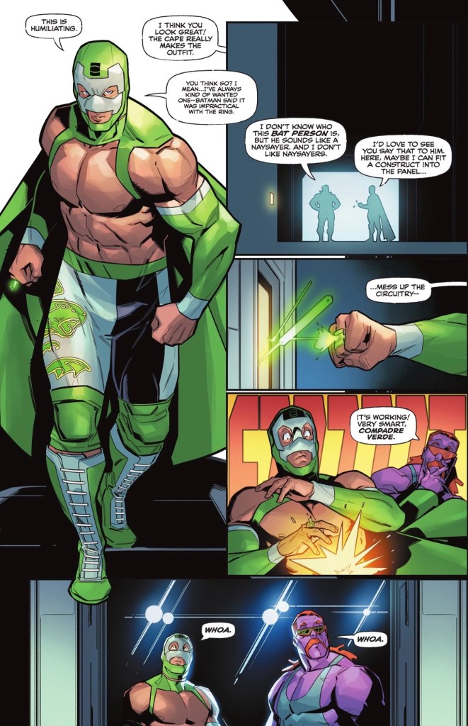 Flashback over, Kyle asks Bam to help him reach the Algorithmic Drive that takes the Hub across time and space to fight on planets about to die. Surely Earth in 2026 qualifies? Bam advises a change of outfit so Kyle won’t stand out in a place where Green Lanterns aren’t welcome.