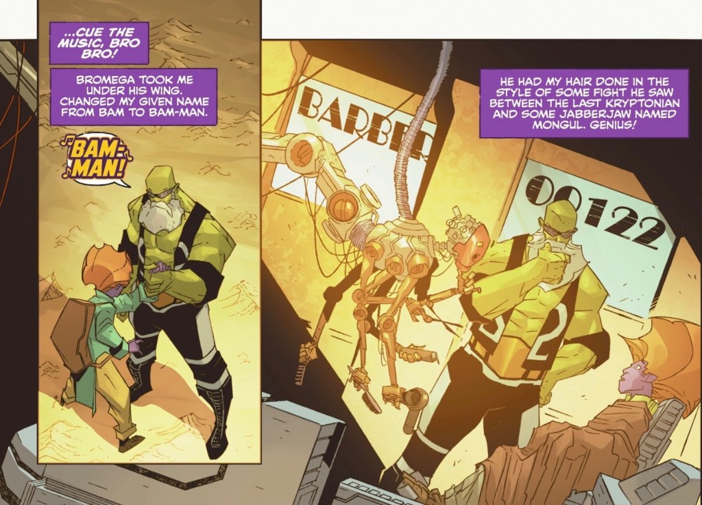 Inspired by catching sight of a WAM bout involving the wrestler Bromega, Bam trains himself to follow in his footsteps. A second meeting with Bromega leads the older man to become his mentor, shaping young Bam into the fierce Omega-Bam-Man. We even get the secret origin of his horrible haircut.