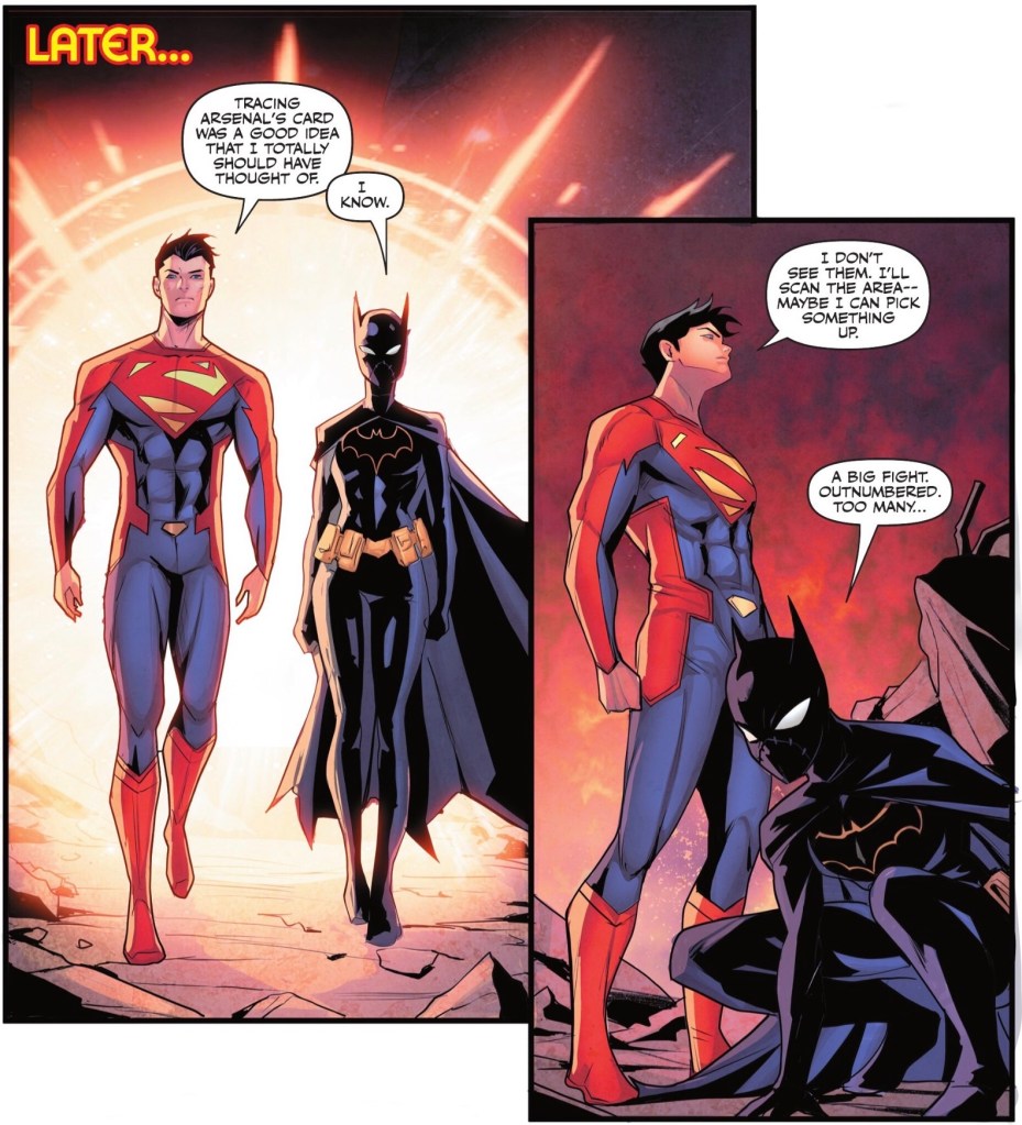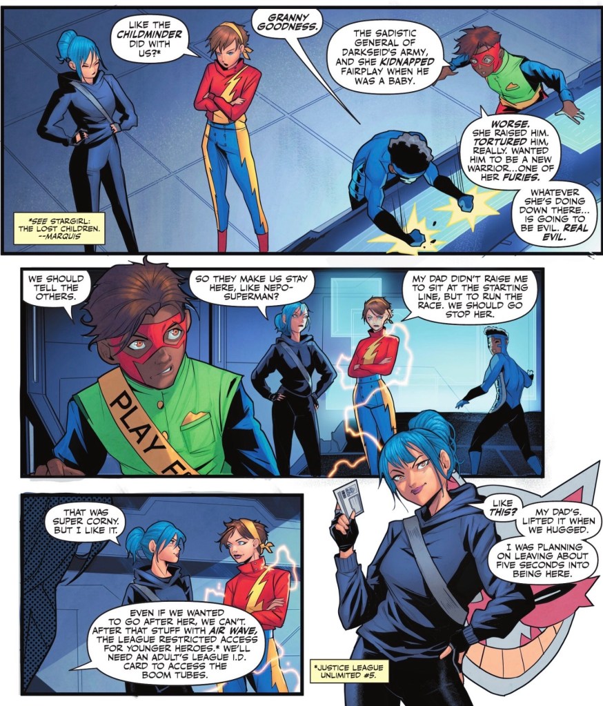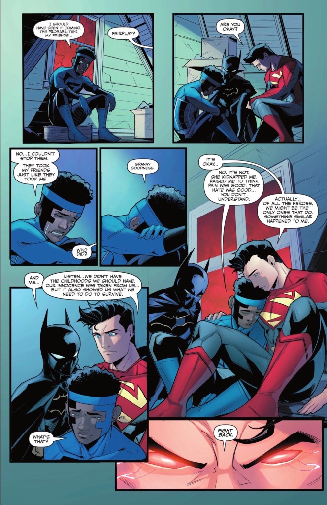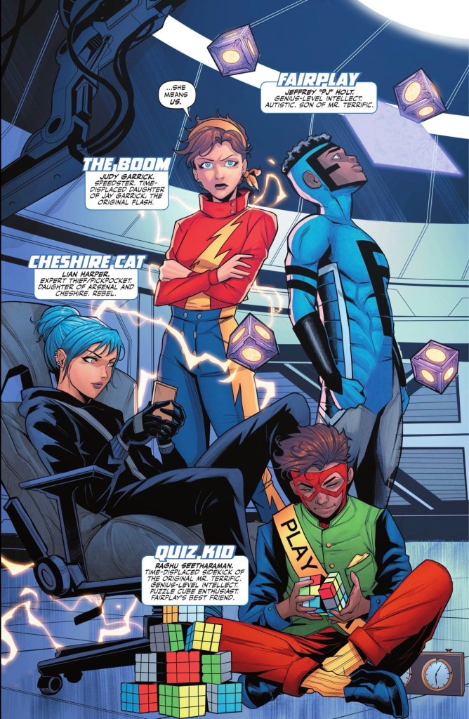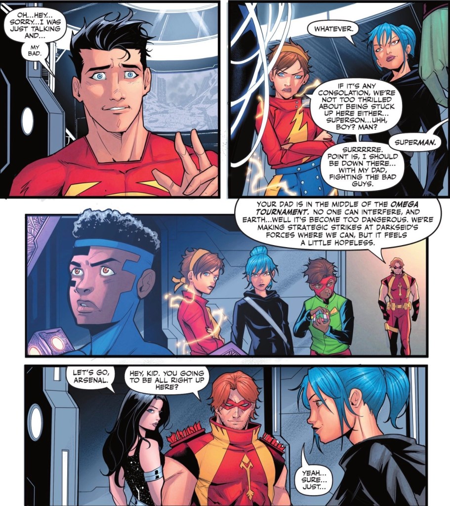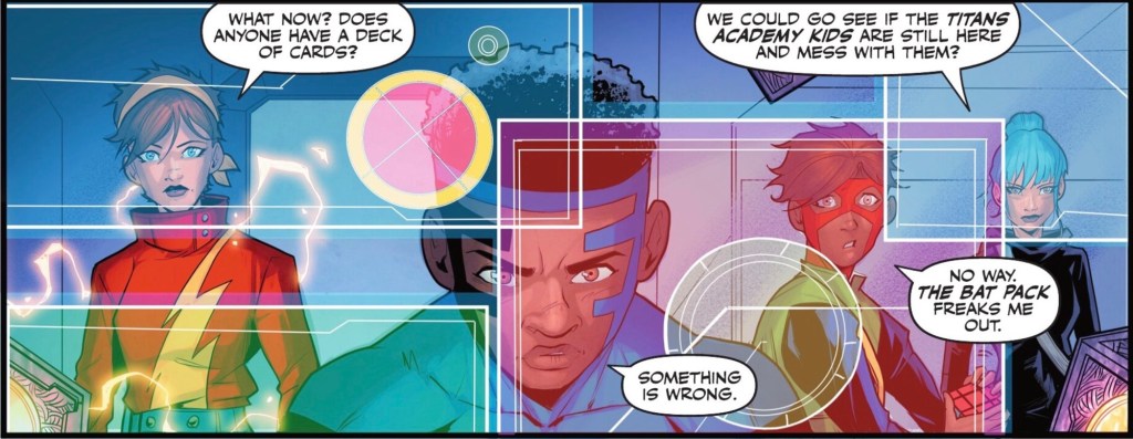 Things I did like included Cheshire Cat’s confidence and smarts, The Boom’s mild mocking of Jon wanting people to call him ‘Superman’ and a cameo by three of the better characters from Titans Academy. There’s also a very nice moment of bonding for three of the young heroes.
