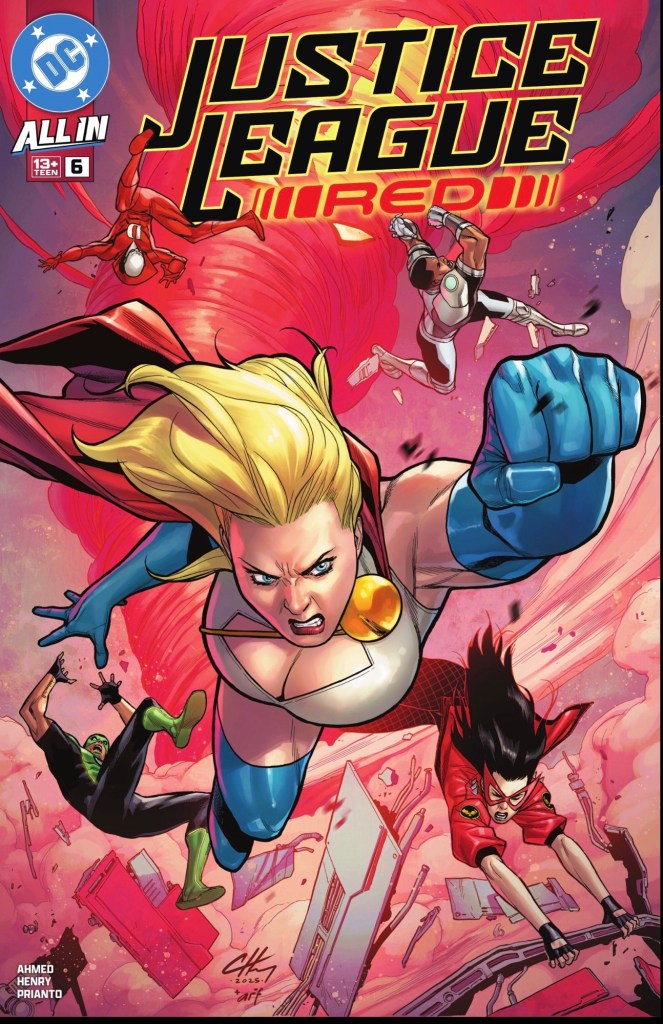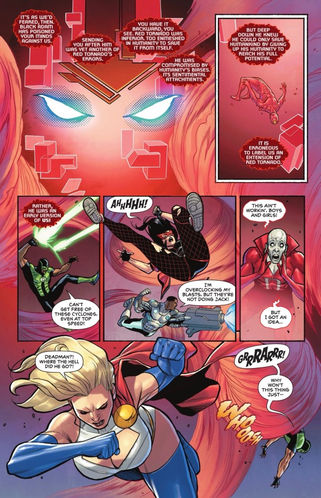 Justice League Red has seen Red Tornado trick Power Girl, Cyborg, Deadman and Green Lantern Simon Baz into joining a secret sub-team, supposedly to stop an ultimate threat. Along the way they’ve picked up young heroine Red Canary, annoyed Black Adam and at the end of last issue they found Reddy subsumed within a massive AI entity calling itself the Crimson Cloud.