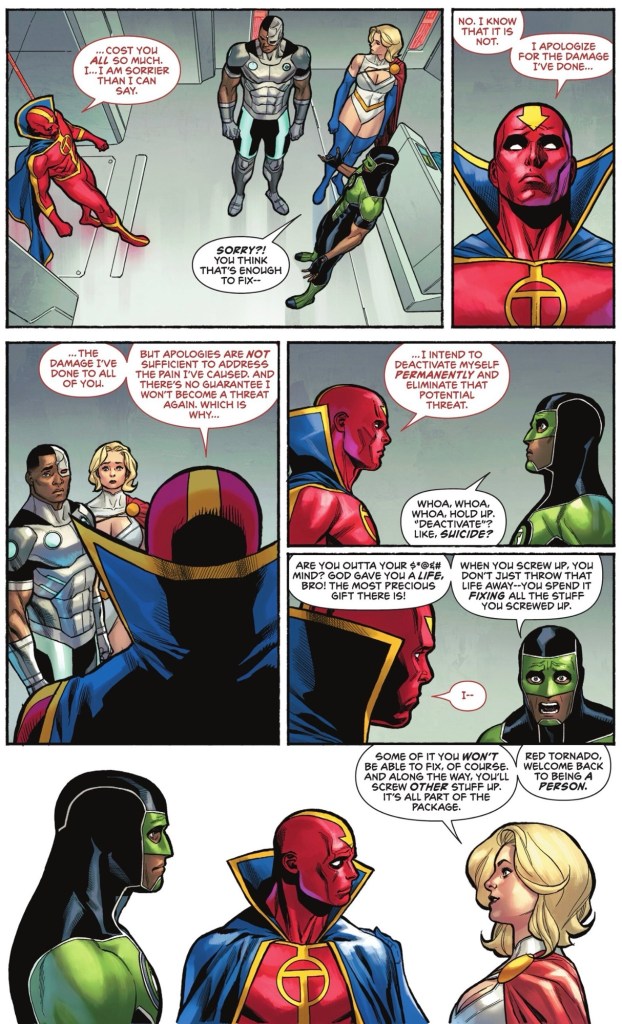Best of all, though, is seeing Red Tornado restored to his full android magnificence, having so far this series been depicted as an AI creation, then an android basket case.