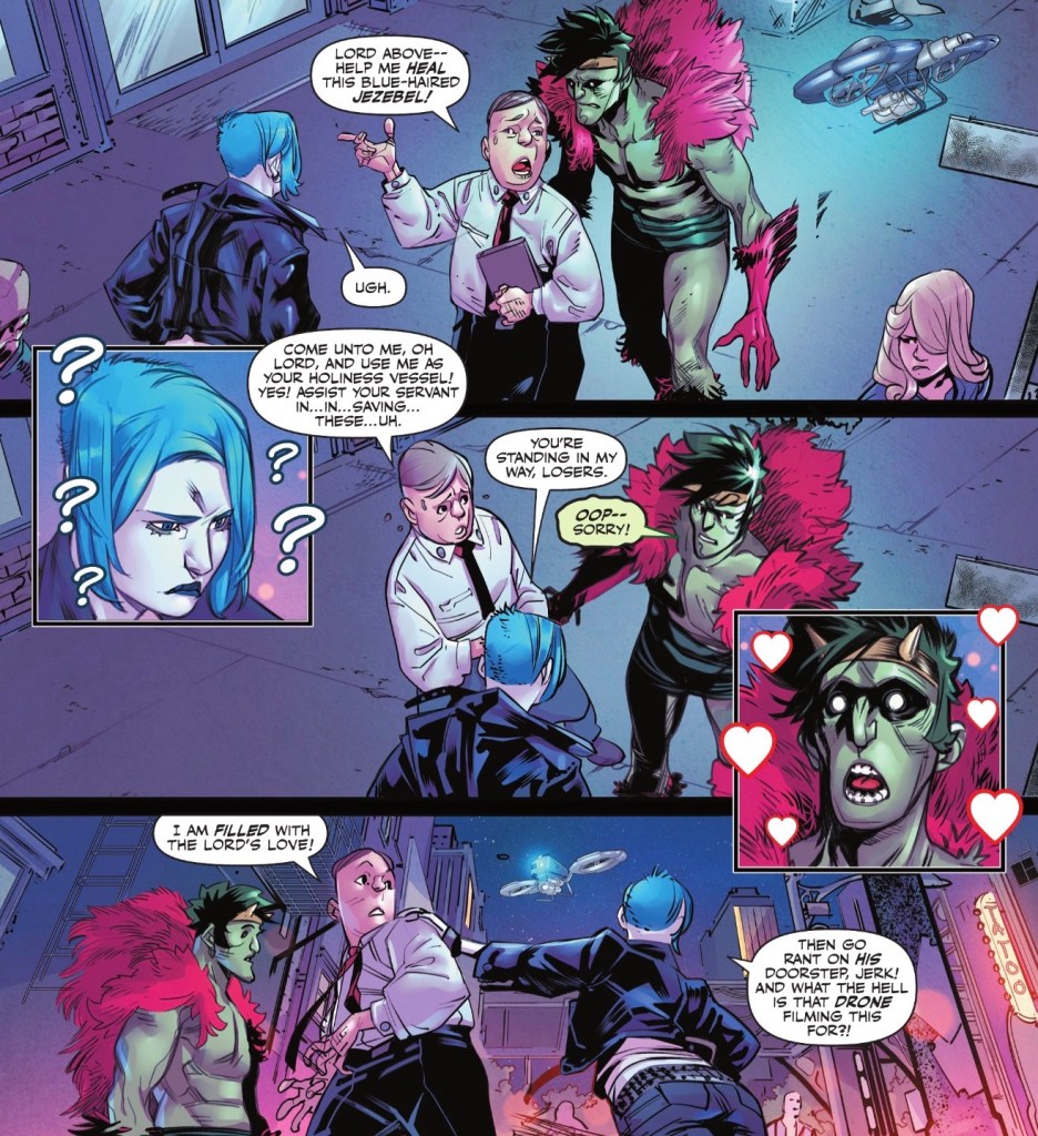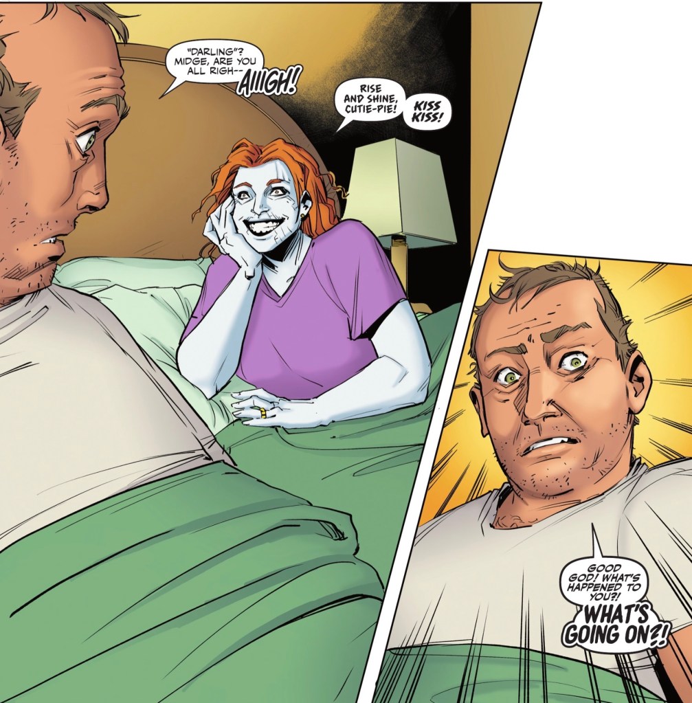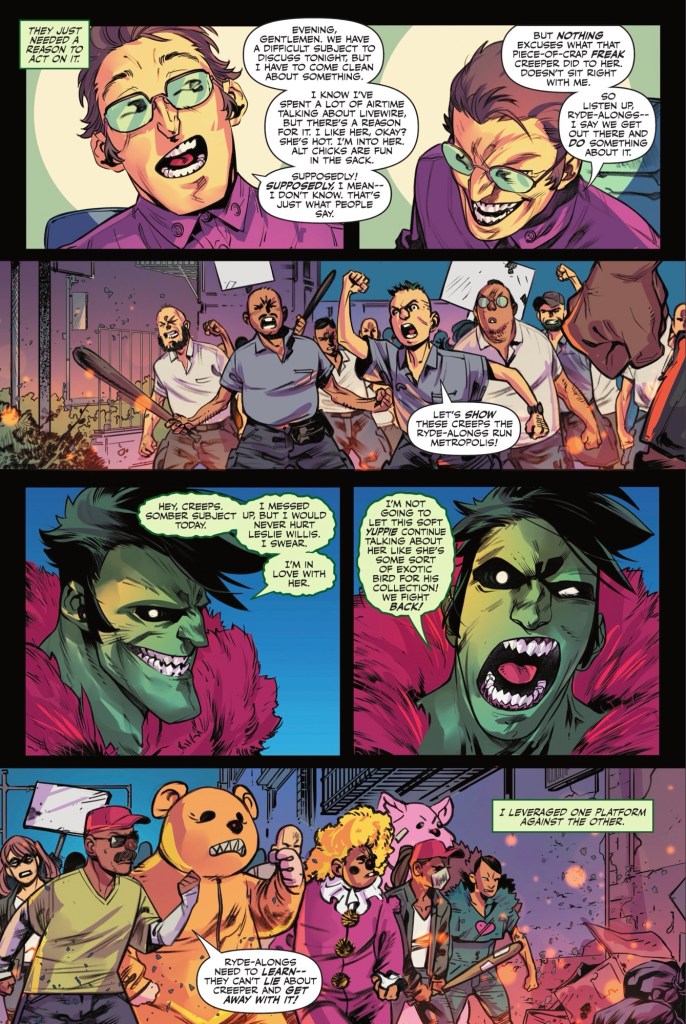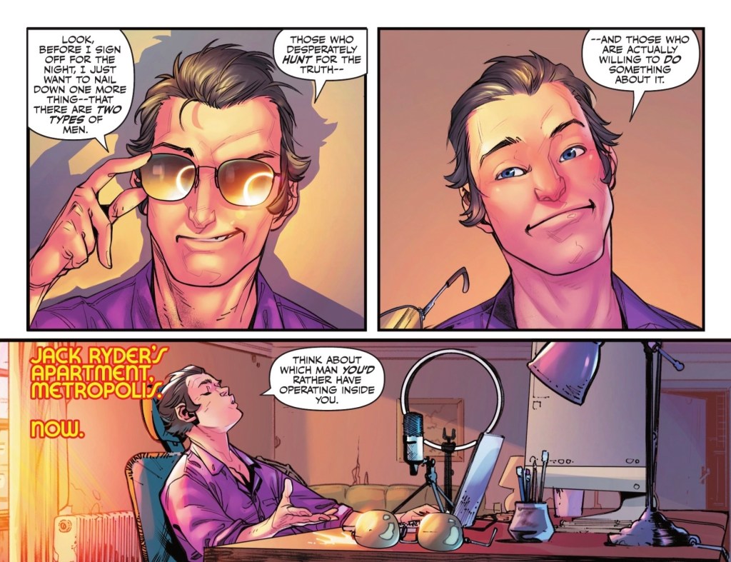 The issue opens with the Creeper’s alter ego, Jack Ryder, traditionally a broadcaster obsessed with finding the truth, operating as podcaster with perhaps a side of incel.