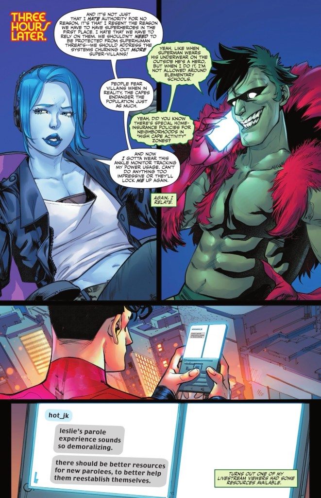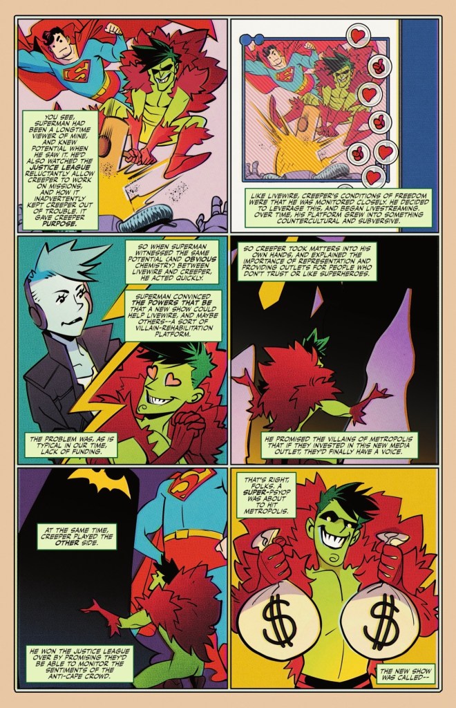 Jon Kent, apparently considering himself a talent spotter, uses his pull at the Daily Planet to get Livewire and Creeper an official TV show, and they decide to interview supervillains.