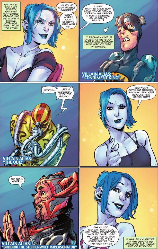 As for the TV show, I suspect Livewire’s interviews with the minor supervillains are meant to be sizzling. They’re not.