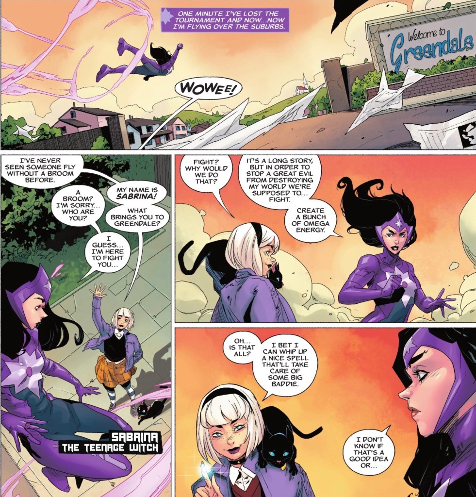 Star Sapphire encounters a very strange and special girl from Archie Comics, Sabrina the Teenage Witch.