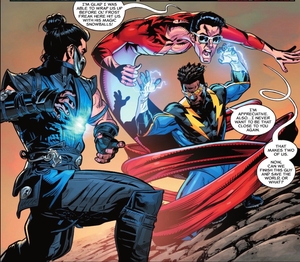 Black Lightning and Plastic Man clash with the world of NetherRealm video game Mortal Kombat.