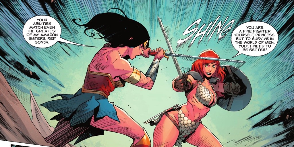 Wonder Woman swaps swords with another Dynamite denizen, Red Sonja.
