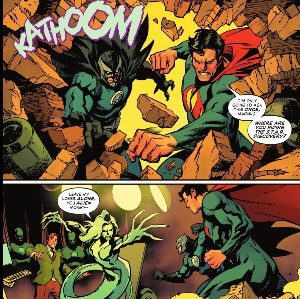 The visit to the Doom Syndicate, it’s fair to say, ends messily for the World’s Strangest Villains, as Ultraman and Owlman get their next lead – the mystery payload is with Dr Will Magnus and his Metal Menaces.