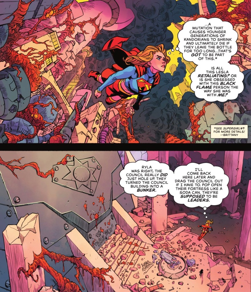 Lesla is central to this issue, having returned to the bottle city of Kandor, where recent events have Supergirl worried. She’s rushed away from the DC KO aftermath to see how things are. They’re not good.