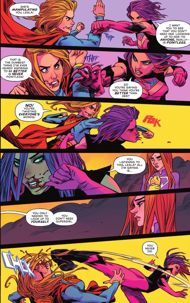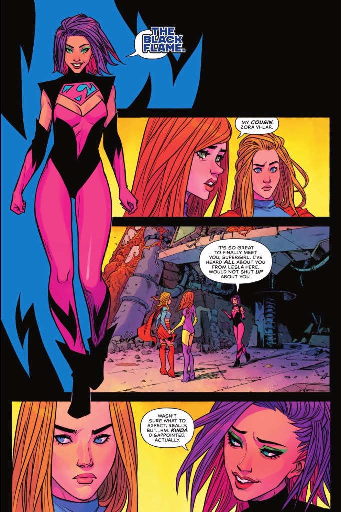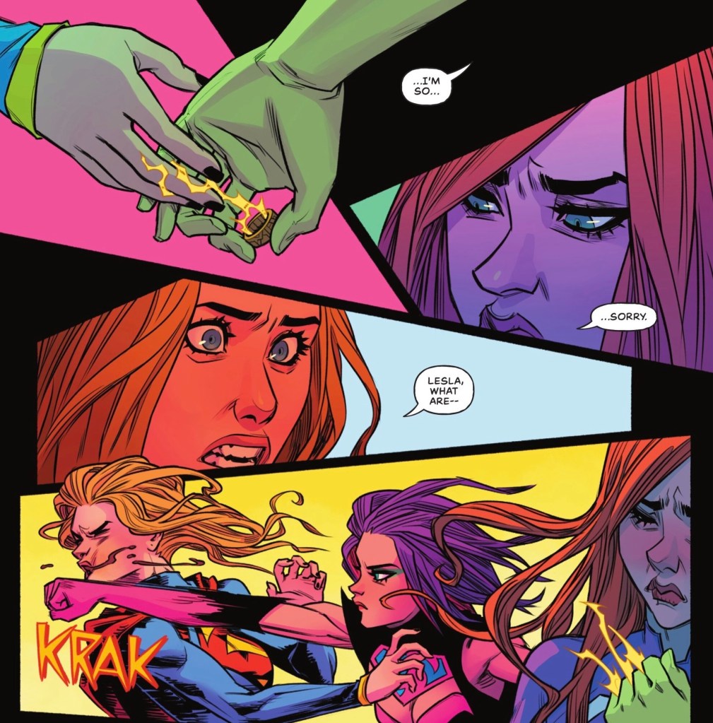 Zora can’t stand that Lesla admires Kara, and Supergirl decides to separate the cousins, taking Lesla’s hand. Lesla takes something else.