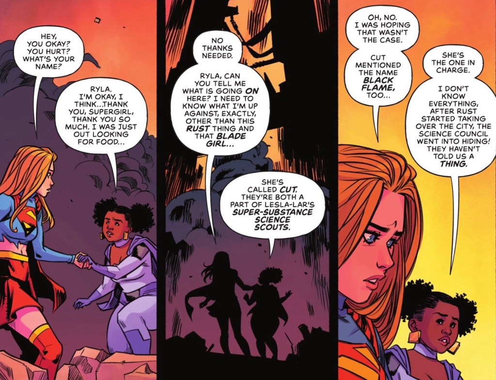 Flying through the last city of Krypton with the aid of a ring that allows her to retain her powers in the city’s artificial red sun atmosphere, Supergirl soon finds Lesla. And someone new.
