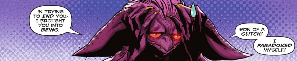 I can let Slott’s error/retcon with Jon & Mr. Oz slide. Maybe Jon was taken and held not just near a volcano on Earth-3, but also in its far future, which is why no one was around. What I can’t let slide is Slott delivering what is clearly a classic 5th Dimensional imp (even with the same naming structure and powers as other 5th Dimensional imps), but accidentally writing that he’s from the “FOURTH DIMENSION.” Not sure how that slipped by the editors.