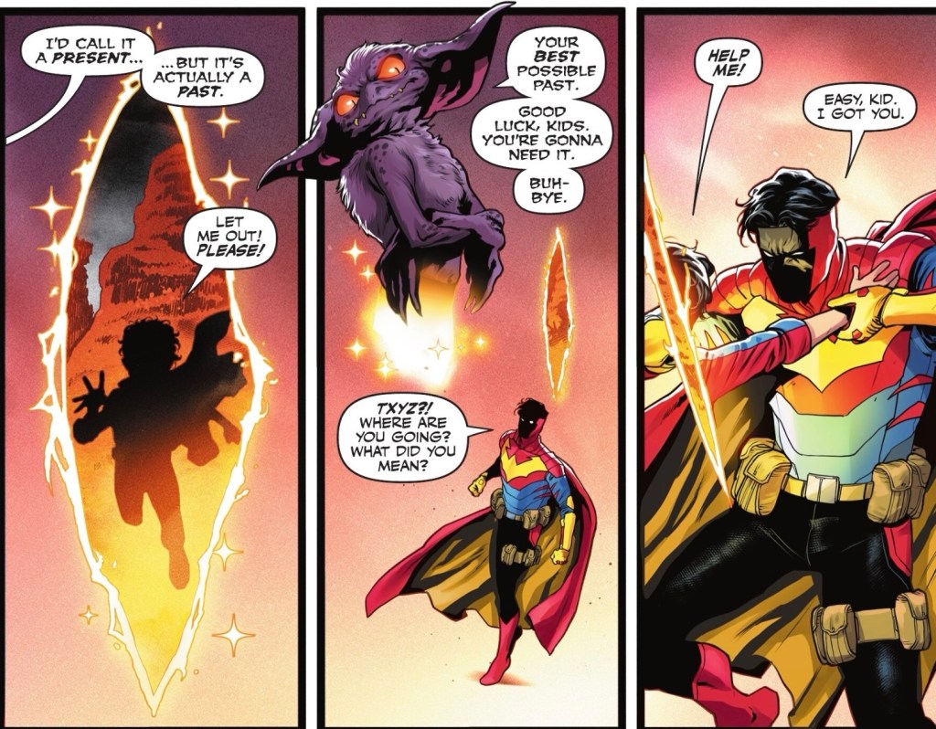 It certainly sounds like a win, but since when do tricksters from Mr Mxyzptlk’s realm play fair? Big Jon, who survived years imprisoned inside a volcano on Earth 3, hugged by the boy he was, rescued from that same prison?