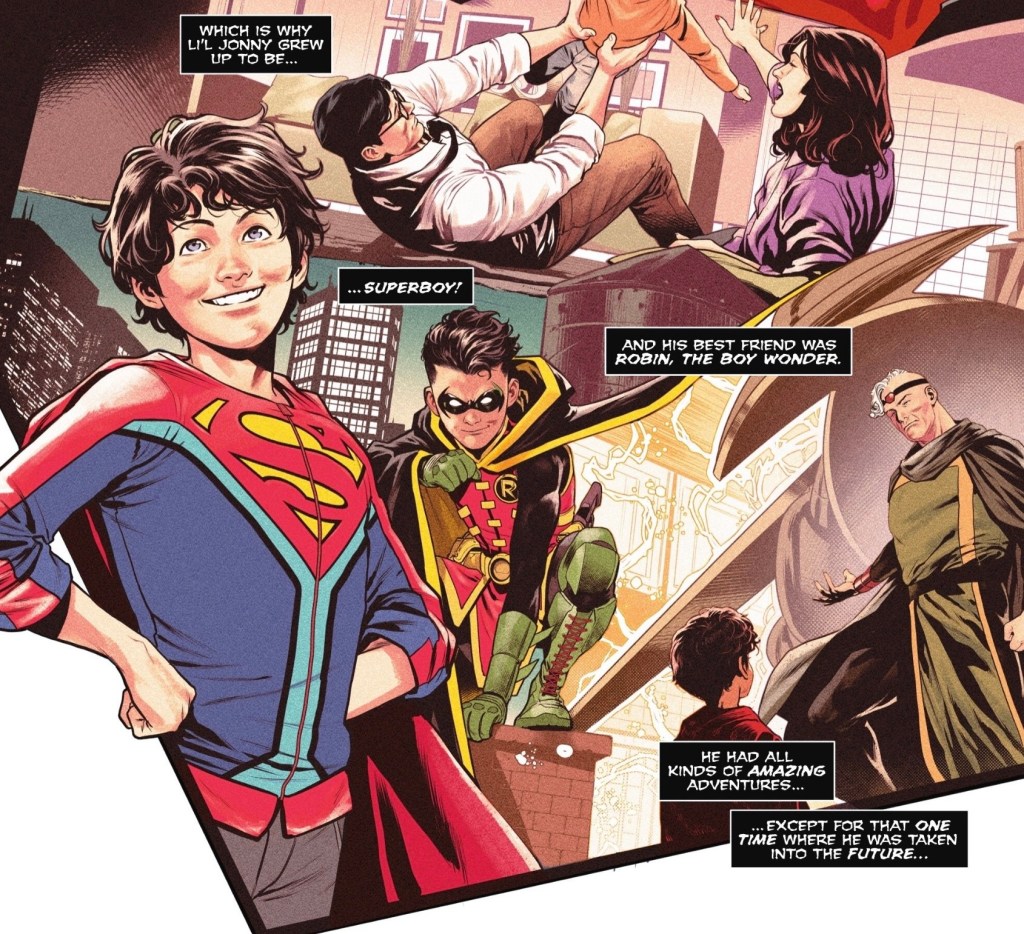 Slott is referencing Brian Bendis’s terrible story in 2018’s The Man of Steel #6. Jon was not taken into the future. Perhaps this is a deliberate change, but I can’t see why that would be…. If you’re going to alter this part of Jon’s past, wipe the whole ruddy thing away!